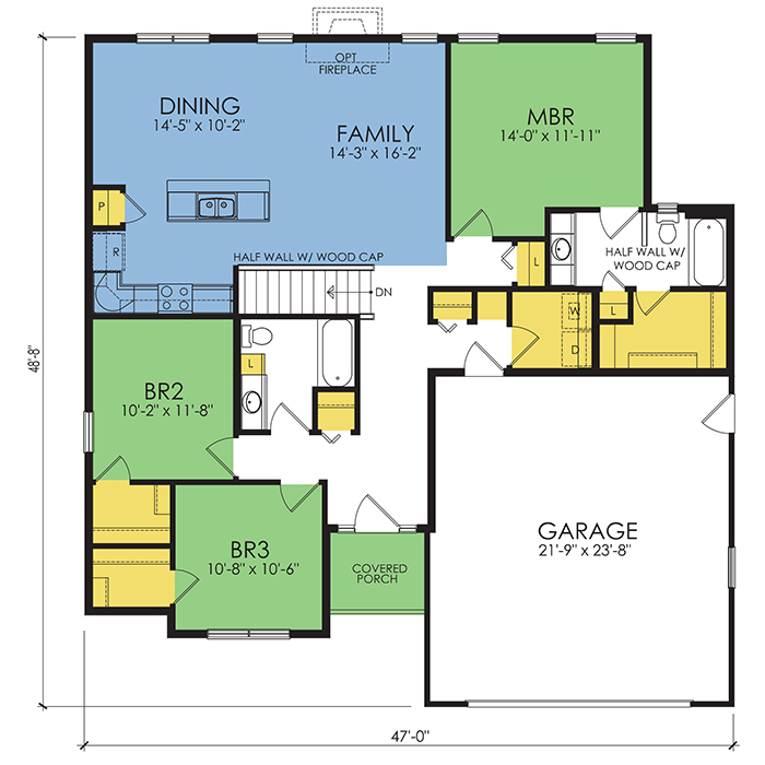 A part of our dream series, the tamarack floor plan features 3 bedrooms and 1.5 bathrooms with a foot print of 44x30 feet and 1342 total square feet of living space.